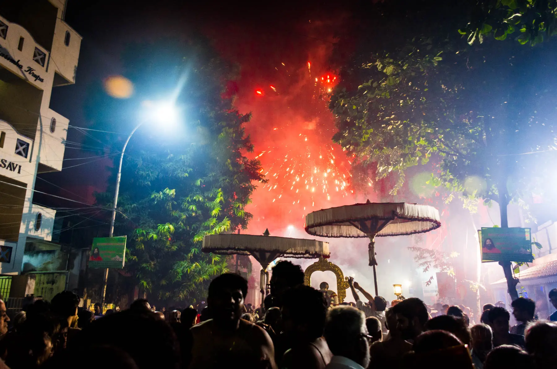 A group of men in crisp white dhoti, south Indian sarongs, are clustered in the street. They’re preceded by women crouched low, sweeping heaping mounds of charred fireworks from the streets to clear the way. Some of the men are carrying drums, beating out a rhythm as other men walk forward bearing gold-plated palanquins on their shoulders.