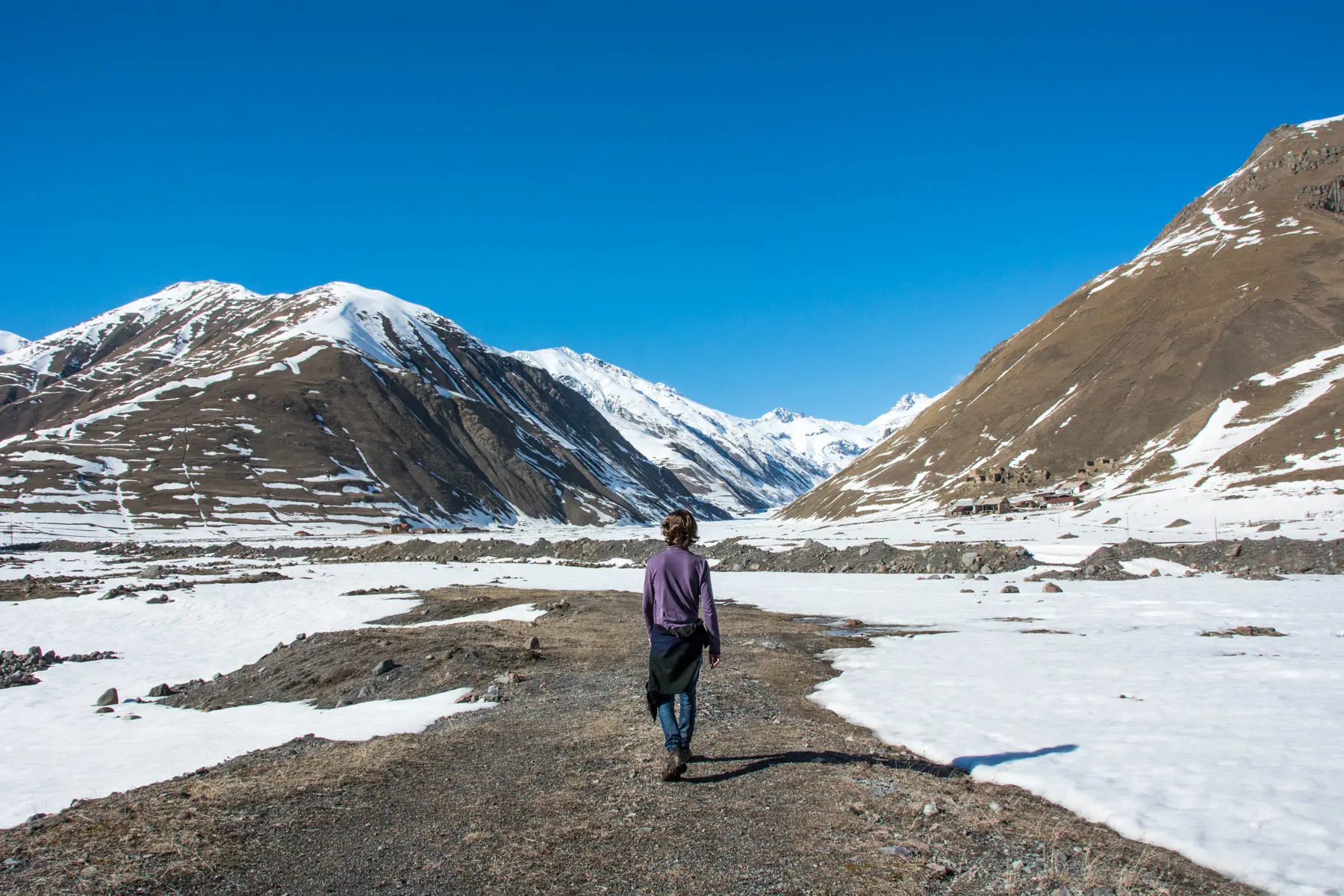 The sun was setting, and it was time to head back to Kazbegi from the valley. After making the slushy several-kilometer slog back to the main highway, we stood on the side of the road with our thumbs out. Many a Russian license plate passed us, their drivers alternating between signaling “no” and giving us long, deliberate, and wholly cold stares (or so they seemed, in our moment of frozen desperation).