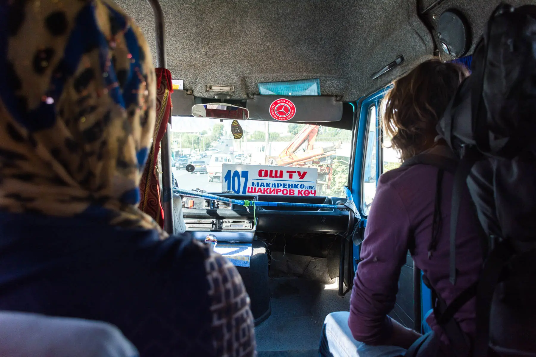 The border crossing between Kyrgyzstan and Uzbekistan at Dostyk is only a couple kilometers away from Osh. To get to the border from the popular Biy Ordo hostel, take marshrutka 107 from Razakova Avenue (Разакова Авенюсы) heading away from the city center. Make sure you get on the 107 marshrutka going to the border, not the airport. The border is the terminus for this marshrutka. A ride is 10 KGS per person.